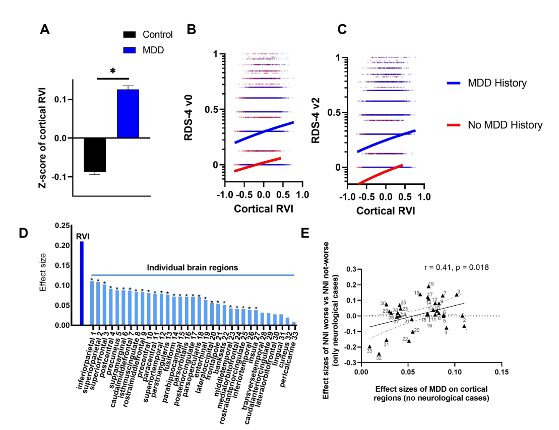 The ENIGMA Major Depressive Disorder (MDD) Working Group conducted meta-analyses on the T1-weighted MRI scans of 2,148 MDD patients and 7,957 healthy controls from 20 sites around the world, analyzing adults and adolescents separately. Adults patients were found to have thinner grey matter in the orbitofrontal cortex, anterior and posterior cingulate, insula, and temporal lobes compared to healthy controls. Adolescent patients had lower surface areas, with effects greatest among recurrent patients. These findings indicate consistent cortical alterations in patients compared to controls and imply that MDD may affect brain structure in different ways depending on age.